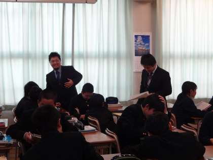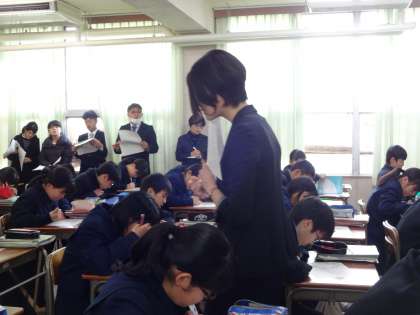 本日の6時間目、1年生4組で阪井先生と鳴瀬先生がティーム・ティーチング、2年3組で宋先生が公開授業をしました。3年生は入試のこともあり公開授業はありませんでした。校区の3小学校の先生方や他の中学校の先生方、高等学校の先生方、委員会や大学の先生方が授業を見られました。本校での英語教育の素晴らしさや生徒の英語を聞く(授業を受ける姿)態度の良さに感心されていました。
