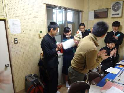 インフルエンザの影響で、本日の朝にお別れ会をしました。残念ながら朝から雨。運動場ですることができません。しかし、明日は公立一般選抜入試で3年生はいません。明後日は卒業式です。しかたなく放送でお別れ会をしました。