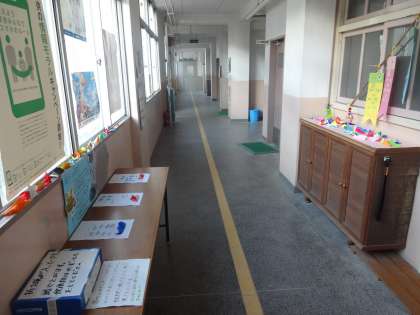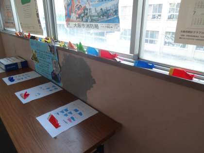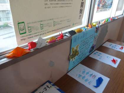 今日はこどもの日です。こどもの日のことは以前にアップしました。校長室前は下駄箱の上だけでなく、窓枠のところにも折り紙がたくさん並びました。