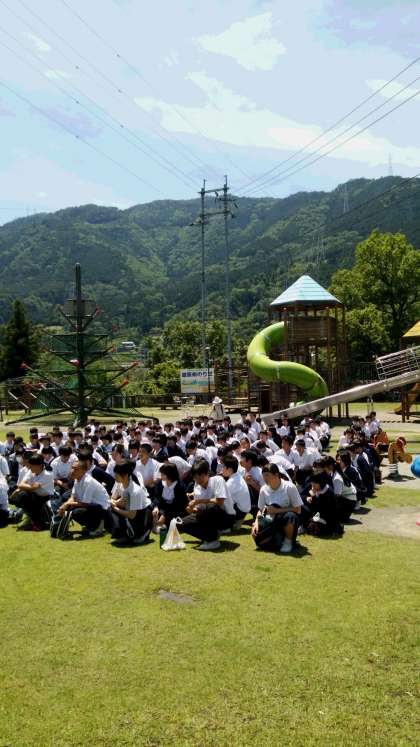 昼食場所に到着。今から学級写真撮影後、昼食タイムです。