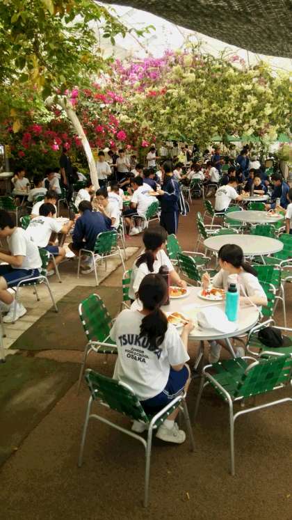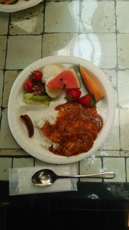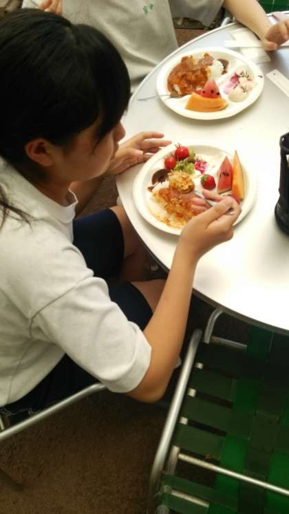 三つのグループが集まり、昼食です。メニューはトマトカレーです。
