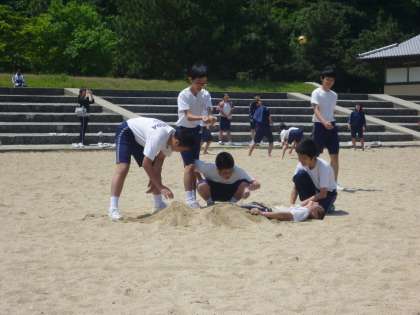 砂遊びでは、大変天気も良く海にも入りたかったところですが、学年の約束を守りました。大変規範意識の高さが身についてきていることの表れがでました。砂浜では砂に友達を埋めたり、ボール遊びなどをしました。