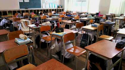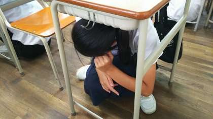 大阪880万人訓練にあわせて避難訓練をしました。まず地震の想定です。しっかりと頭や体を保護しました。