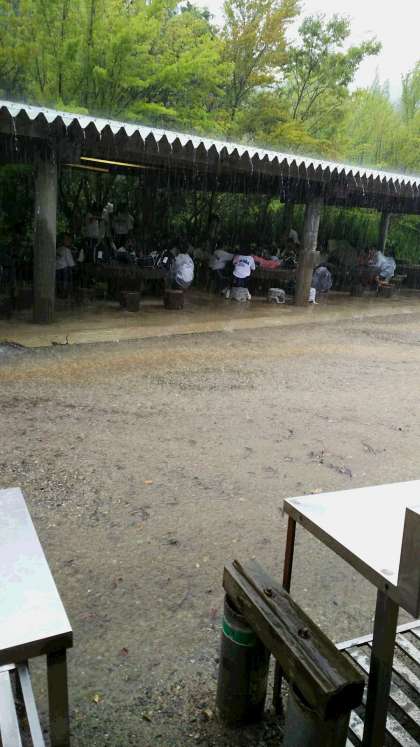 炊飯場へ移動はしましたが、強い雨が降っています。子どもは待機しています。
