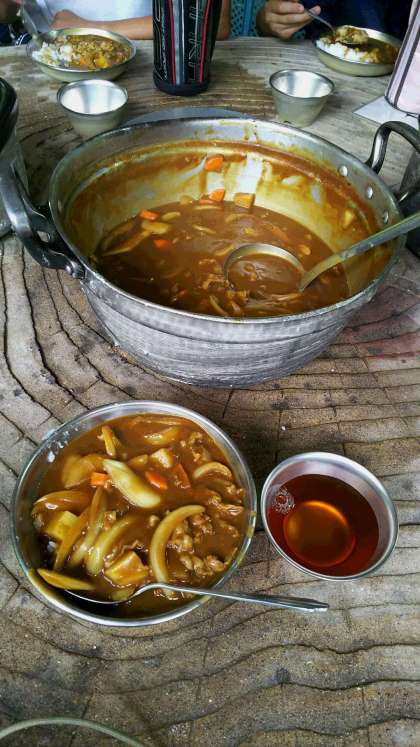校長先生のカレーです。班のみんなが力をあわせて作ってくれました。今から食べます。味を楽しみます。