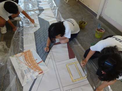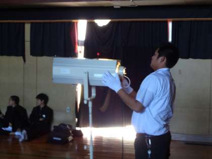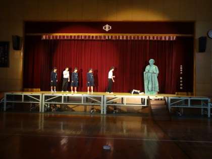 本日の5時間目に3年生が体育館の舞台を使っての練習をしていました。教室では背景の作成をしていました。