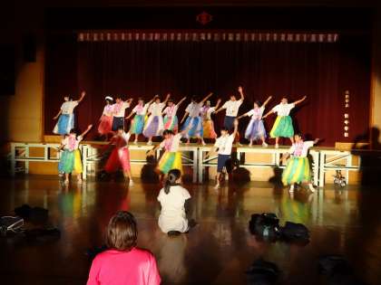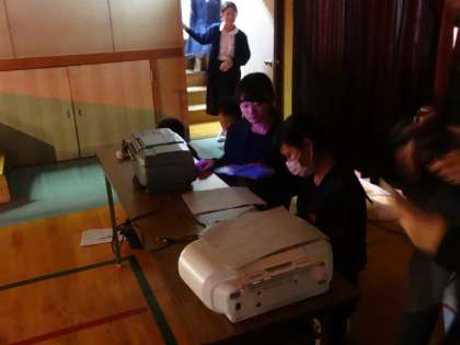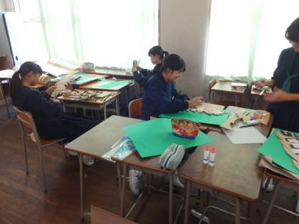 本日の5時間目に2年生が体育館で練習をしていました。教室では背景作りに取り組んでいました。