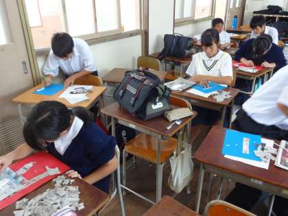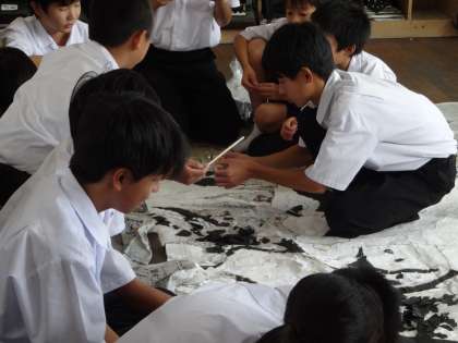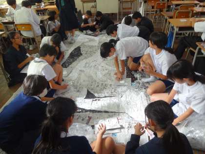 昨日の1年生の共同作品の作製です。本日、それぞれの学級で作製したものを合わせ完成しました。学芸発表会での披露を楽しみにしてください。
