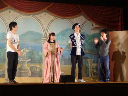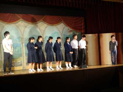 代表生徒として9名の3年生が舞台に上がりました。さらに、その中から男女各1名、計2名の生徒が衣装を着て、鑑賞した劇の一場面を演じました。生徒の演技は素晴らしく、会場が盛り上がりました。