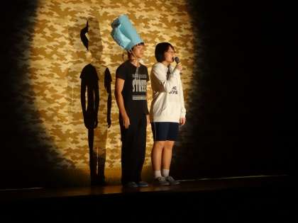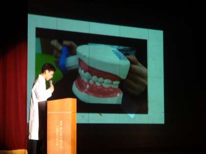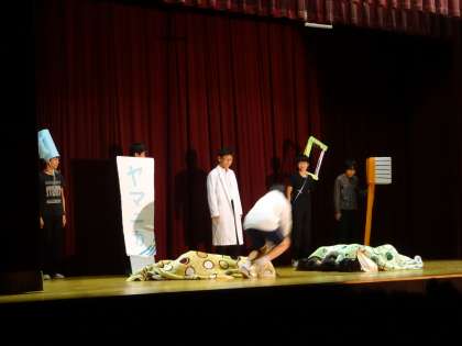 プログラム順で本日は保健委員会の発表の様子です。保健委員会では歯の健康について寸劇やパワーポイントを使い、歯磨きの大切さを全校生徒や保護者に訴えました。