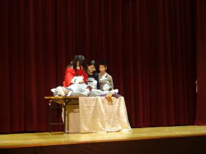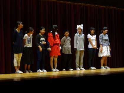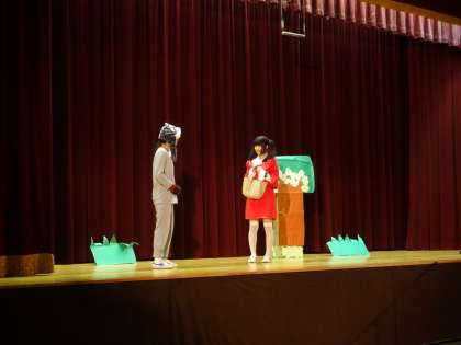 ESS部の発表の様子です。赤ずきんちゃん(Little Red Riding Hood)を解説者を含め、演技者もすべて英語で劇を進行しました。手振りや身振り、衣装などで効果をだし、みんなが知っている話で見ている生徒も聞き入っていました。