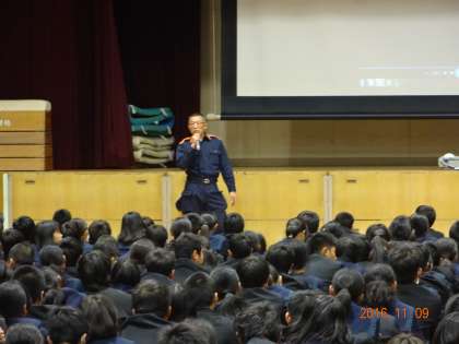 避難訓練としてグランドに避難後、今回は体育館で消防署の方からの講話とビデオを見ました。
