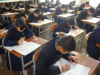 期末テスト2日目の1限のテスト、社会が配られ(上の写真)、子どもたちはチャイムと同時(真ん中の写真)にテストに向き合いました。それぞれが真剣に取り組んでいます(下の写真)。本日の2限は技術家庭科です。