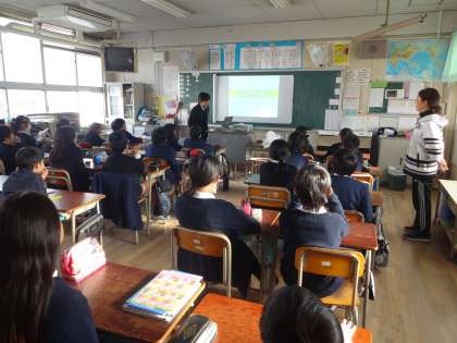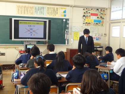 先週の金曜日には佃西小学校、本日は佃南小学校、佃小学校の5年生の児童に本校の数学科の玉川先生が、算数の授業をしに行きました。