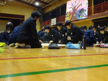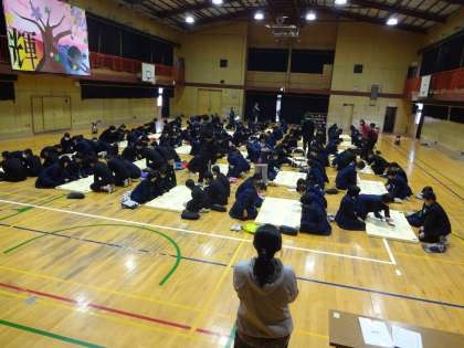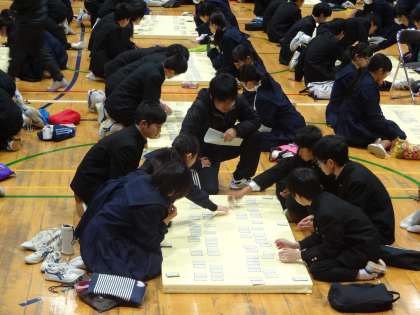 午後から2年生が百人一首大会を行いました。畳1枚に札が並べられ、2学級対抗で各学級3名ずつ計6名で取り合いました。