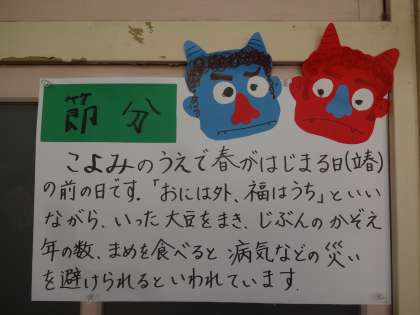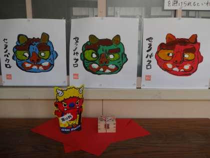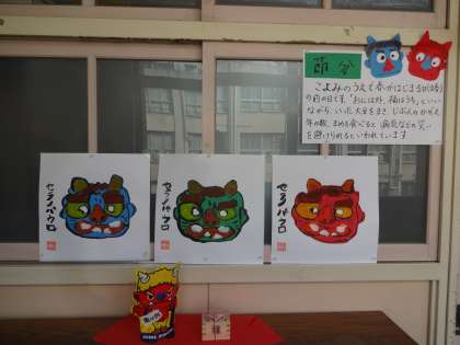 校長室前に節分の飾りをしました。特別支援学級の生徒も鬼の絵を掲示しました。