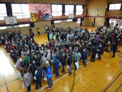 避難してこられた地域の皆様が、集まり話を聞かれています。約300名の地域の方が来られました。(上の写真)
