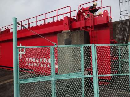 赤い水門も少しですが、動かしました。大変大きな音とともに動きました。(真ん中の写真)