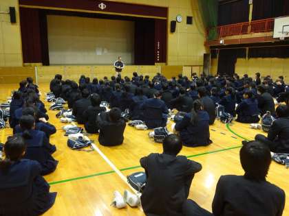 また、1・2年生は明日が学年末テストの最終日です。テスト教科は英語と技術家庭科です。来年度の学年のことを考え、しっかりと学習をし明日のテストに臨んでください。