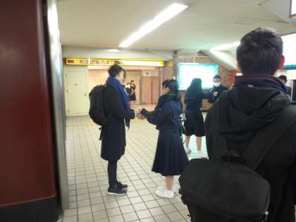 124名の3年生が本日、公立高校一般選抜入試試験に臨みました。駅では、私学専願者が励ましのエールを送りにかけつけていました。一番下の写真の奥に移っている男女は受験生(女生徒)にグータッチをしていました。