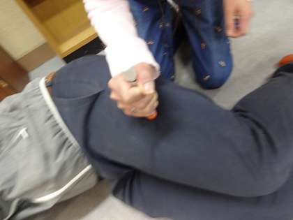 校医先生の田井先生からアレルギーなどのことについての講話をしていただいた後、エピペンの練習用キットを使い実践も行いました。