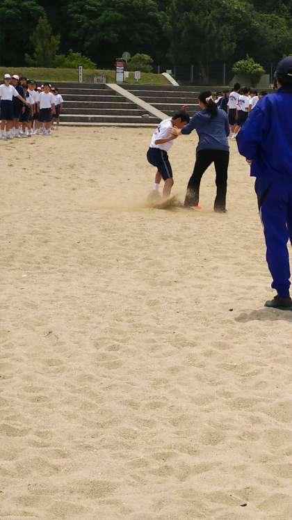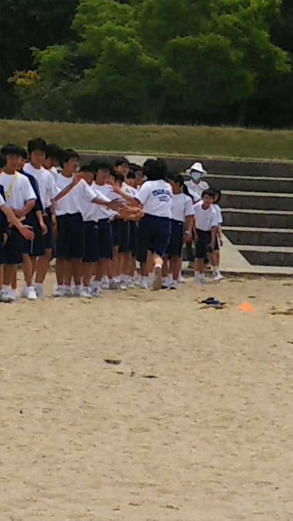 砂浜で楽しんでいます。グラス対抗全員リレーです。