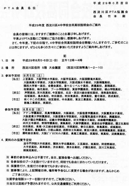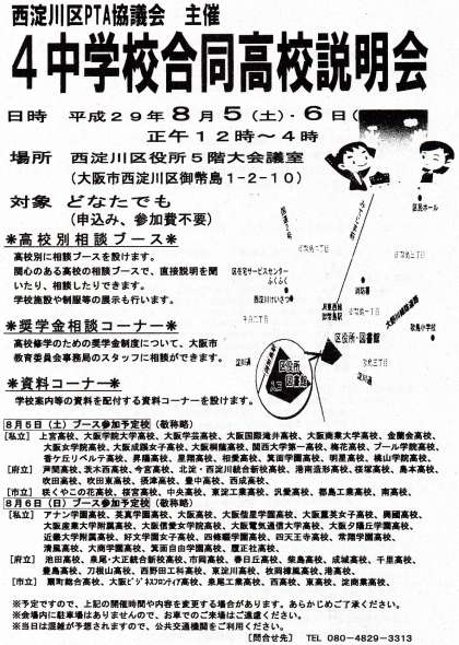 区PTA協議会が主催となり、西淀川区役所5Fで明日と明後日の土曜・日曜で「H29年度 西淀川区4中学校合同高校説明会」が12:00〜16:00まで開催されます。