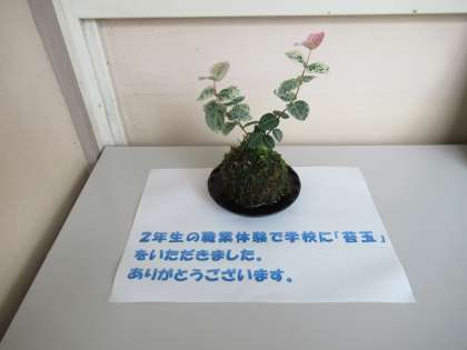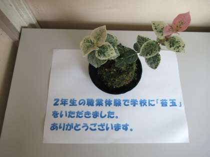 2年生の職業体験で、「苔玉」を学校にいただきました。校長室前の下駄箱の上に置きました。ご来校の折、見てください。
