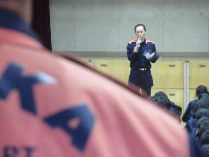 さらに体育館に入り、火災の学習をし、消防署の方から指導講評をいただきました。
