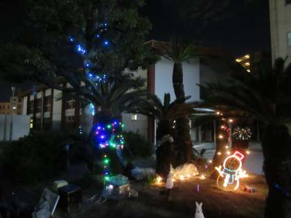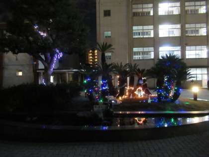 正面玄関の池周辺がとてもきれいです。生徒会の皆さんが、クリスマスのこともありイルミネーションをしてくれました。よろしければ、夕方から夜に本校の正面玄関のあたりを散歩してみてください。