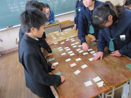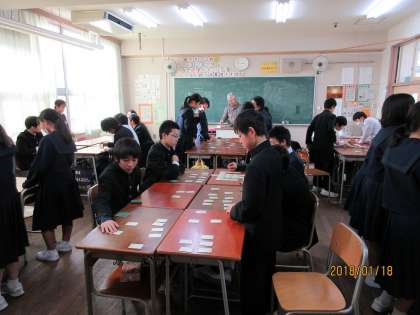 今日の5・6限目の時間を使ってクラスで百人一首の練習をしました。集中して札と睨めっこをしている姿は真剣(スゴイ!)でした。大会当日が楽しみです。