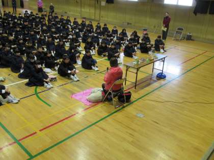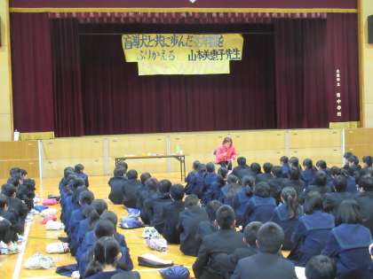 山本さんから、盲導犬と共に生活してきたこと、盲導犬の仕事、また山本さんの生い立ちなど、たくさんのお話を聞きました。特に「人に感謝されることの喜びを大切に」ということが印象に残りました。いろいろな立場の人を互いに理解し、ともに助け合いながら生活していくことの大切さを学ぶことができました。