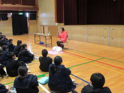 ここまで1年生はアイマスクや白杖体験などをし、障がい理解教育を進めてきました。本日は、「盲導犬と共に歩んだ35年間をふりかえる」というテーマで山本美惠子さんをお招きし話を聞きました。