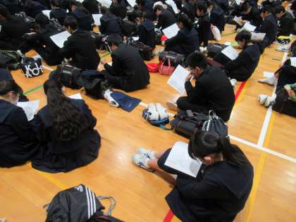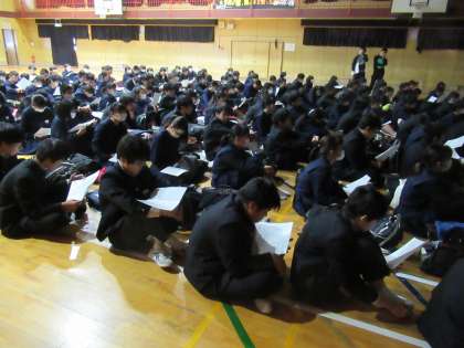 明日の試験に備え、本日と明日のことについて、事前指導を行いました。あえて新しいことは何もいりません。服装は大切です。大丈夫ですか。明日の持ち物等準備は今日中にしておきましょう。明日は、千船・御幣島・出来島、または徒歩とそれぞれ受験校により異なります。間違いのないようにしましょう。