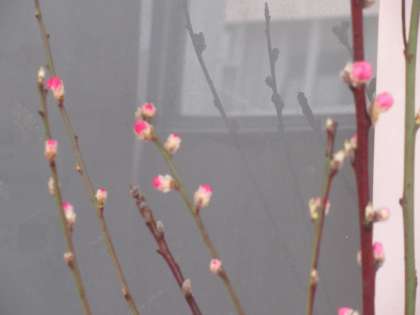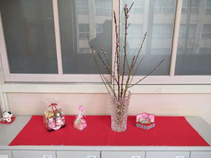 校長室前に雛飾りをしました。桃の花が咲くのを楽しみにしています。