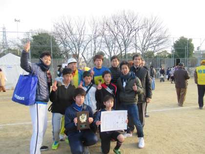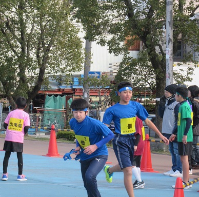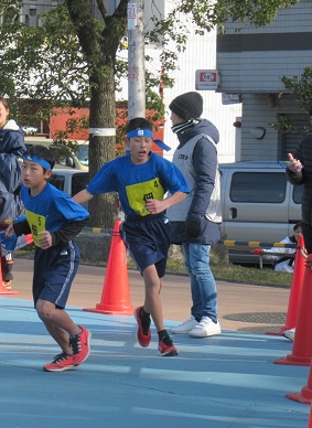 親子マラソン、一般参加の駅伝があり、最後に地域対抗の駅伝がありました。各地域から代表で8名が地域のタスキをつないでいきます。8名のうち本校の中学生が3名選ばれ、たすきをつなぎました。佃地域は、最初から先頭集団でがんばりました。