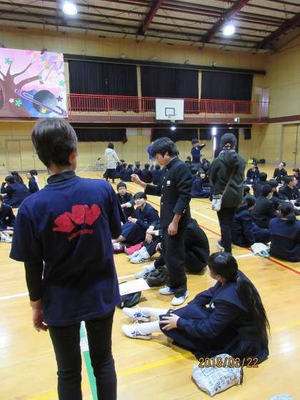 本日の講師として、西淀川手話サークル「スリーファイブ」の方々と西淀川区社会福祉協議会の方に来ていただきました。学習内容は、20人のグループに分かれ各班に講師の方が1名ついて手話の指導をしていただきました。内容は、指文字で名前紹介する。次に、ヘッドホーンをつけ音が聞こえない体験をする。最後に、ヘッドホーンをつけた人(眼で聞いたことを紙に書く)に、グループのみんながゼスチャーで伝言をするなどの学習をしました。