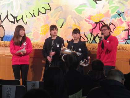 このイベントは区内在住の小・中学生の個人またはグループの舞台発表です。区内の4中学校も出演しました。会場の皆さんを引き付ける素晴らしい演奏を吹奏楽部の皆さんが披露してくれました。また最後に、司会者からのインタビューにも上手に中学生らしく答えていました。