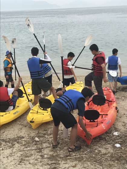 シーカヤックは、穏やかな海で体験することができました。ペアで自由に海を行き交い、終始、楽しんでいます。片付けは全員で協力し、いよいよ入村式へと臨みます。