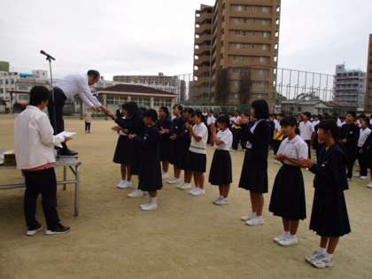 本日の全校集会から新生徒会の生徒たちが司会をしてくれます。大きな生徒会長の挨拶で元気よく始まりました。漢字検定合格者、総文祭作品出品者、バレー部の表彰伝達がありました。