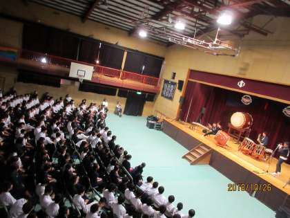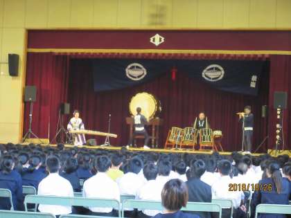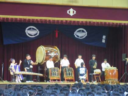 芸術鑑賞「和太鼓集団 独楽」の演奏を5・6限目に開催しました。