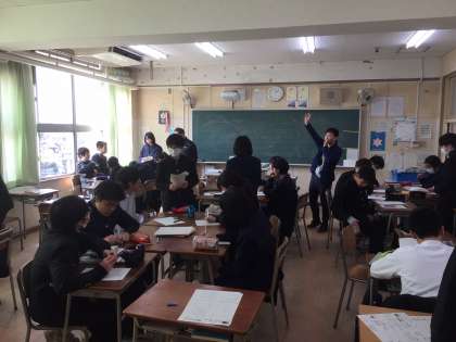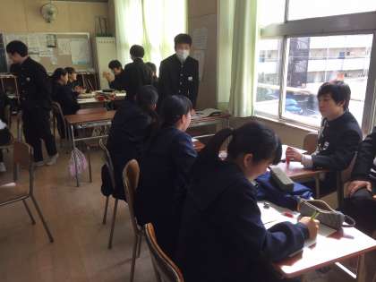 3年2組の生徒たちは4時間目にグループの前で自ら英作した文章をプレゼンして回る取り組みを行いました。