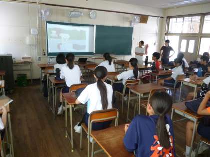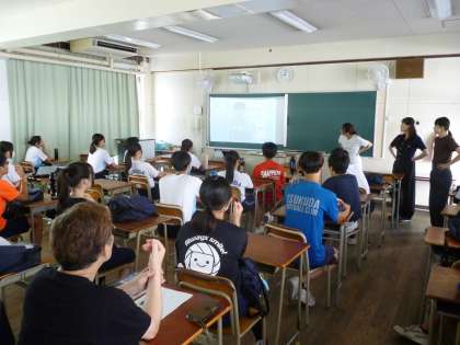 夏休み初日は、部活動代表生徒が集まって救命救急講習を行いました。前半は教室でビデオを視聴し、急病人がいた時の対応の仕方とAEDの使い方の手順、止血法などについて学びました。