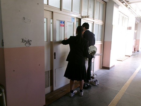 写真は、昼休みに衛生委員がクラスを代表して洗濯しに行く様子です。