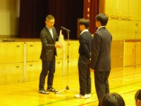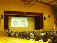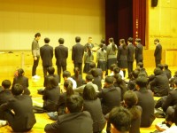 写真の生徒たちは、教員に修学旅行のことでたくさんの質問をしています。