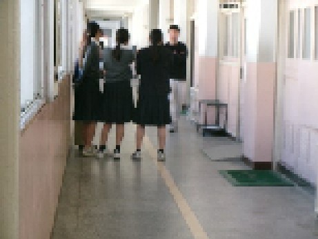 写真の生徒たちは、教員に修学旅行のことでたくさんの質問をしています。