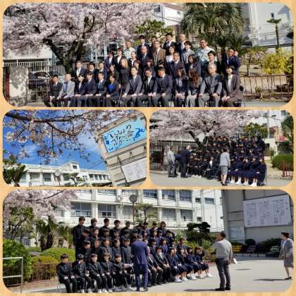 快晴の下、満開の桜を背景に全教職員がカメラに収まりました。
