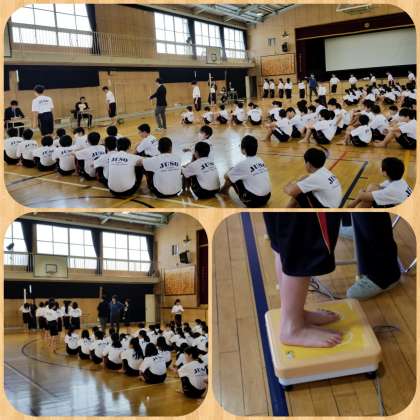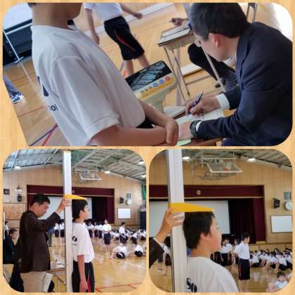 大きな体育館に体操服姿で、誰ひとりとして私語を発することなく、1年生集団が静かに二測定を行っていました。入学したばかりの1年生集団ですが、きちんと列を組み、整然と行われていました。