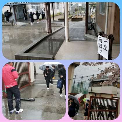 朝の登校、生徒が水溜りで足を濡らさないようと、先生が水切り棒で水を排水溝へと押し出します。早朝より本当にご苦労様です。