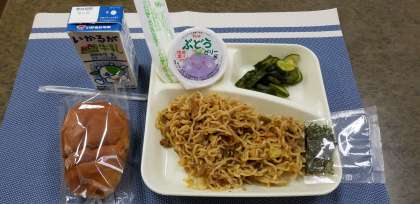 主食はパンです。焼きそばにきゅうりのしょうがづけ、デザートに冷たいゼリーがついていました。
